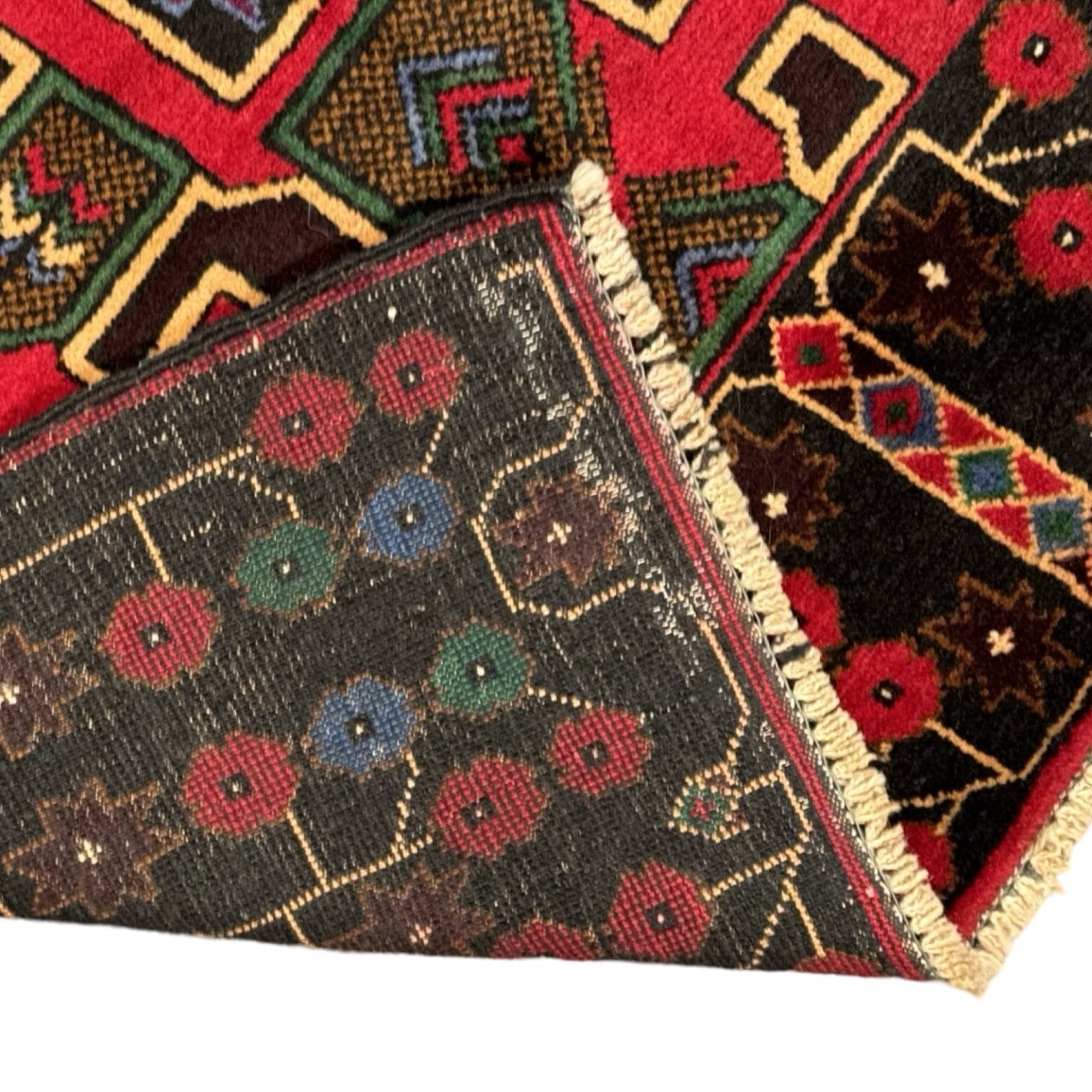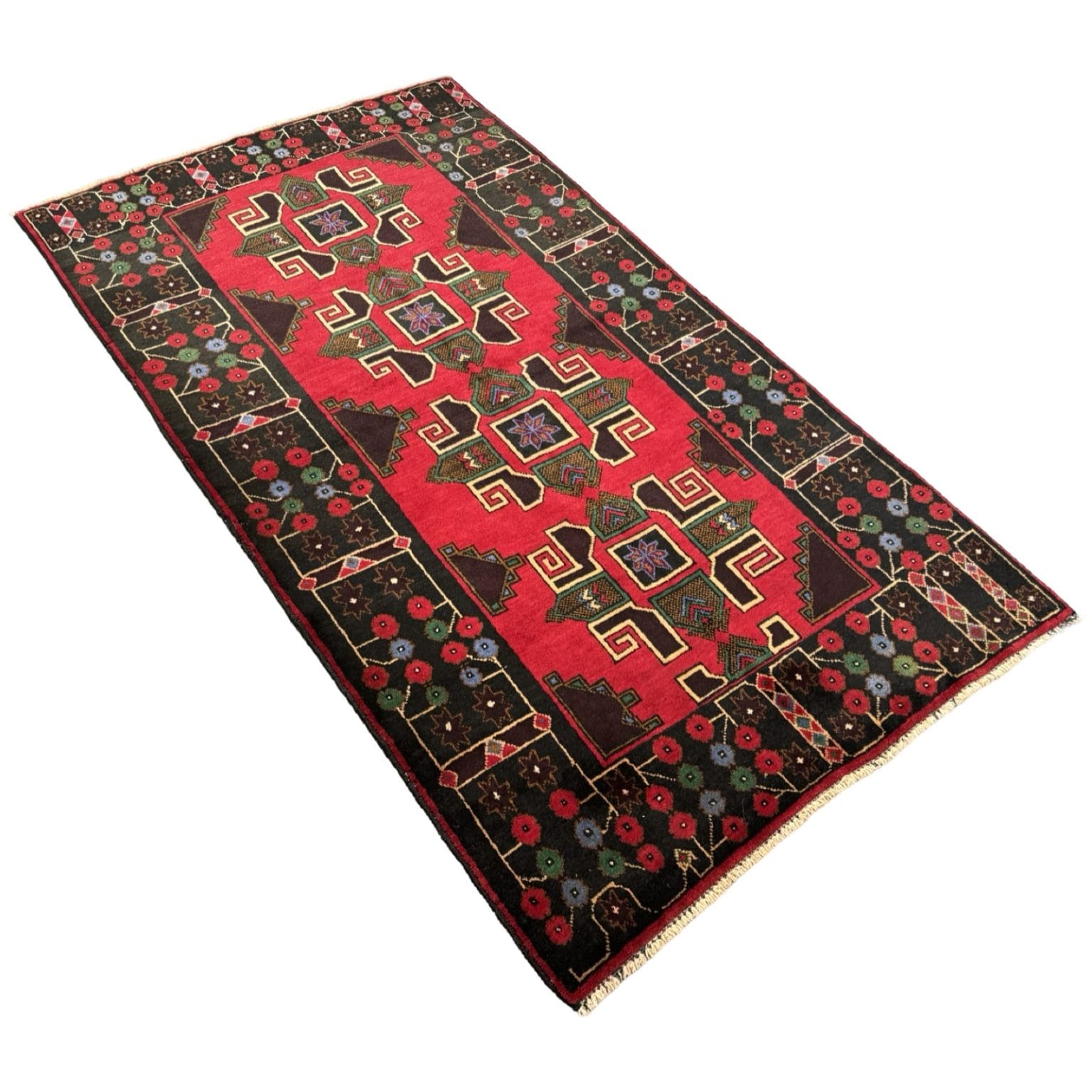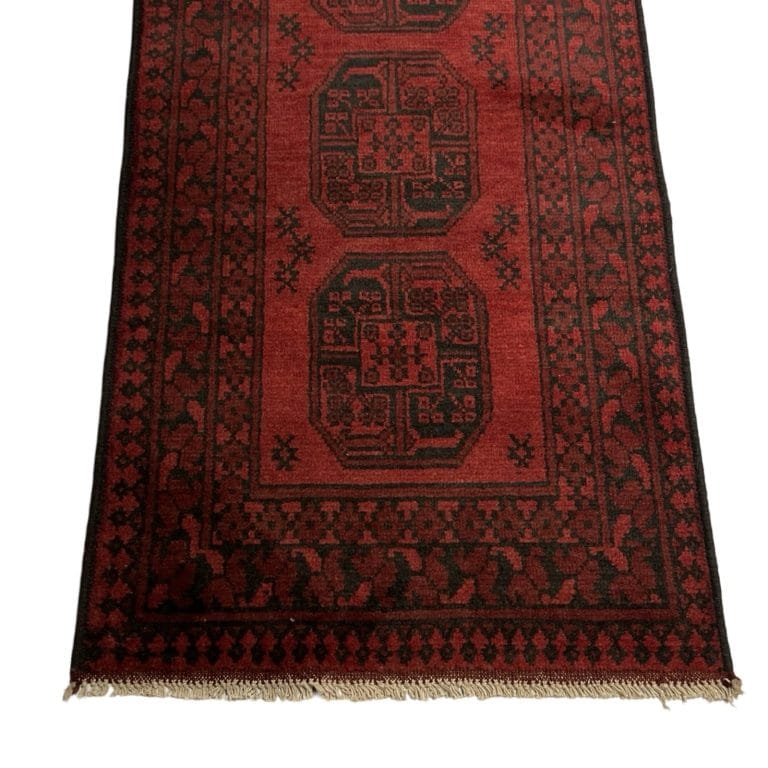 The Baluch rug from Afghanistan is a traditional handwoven rug known for its intricate geometric patterns and deep, earthy colors. It typically features motifs inspired by tribal heritage and is prized for its durability and craftsmanship.