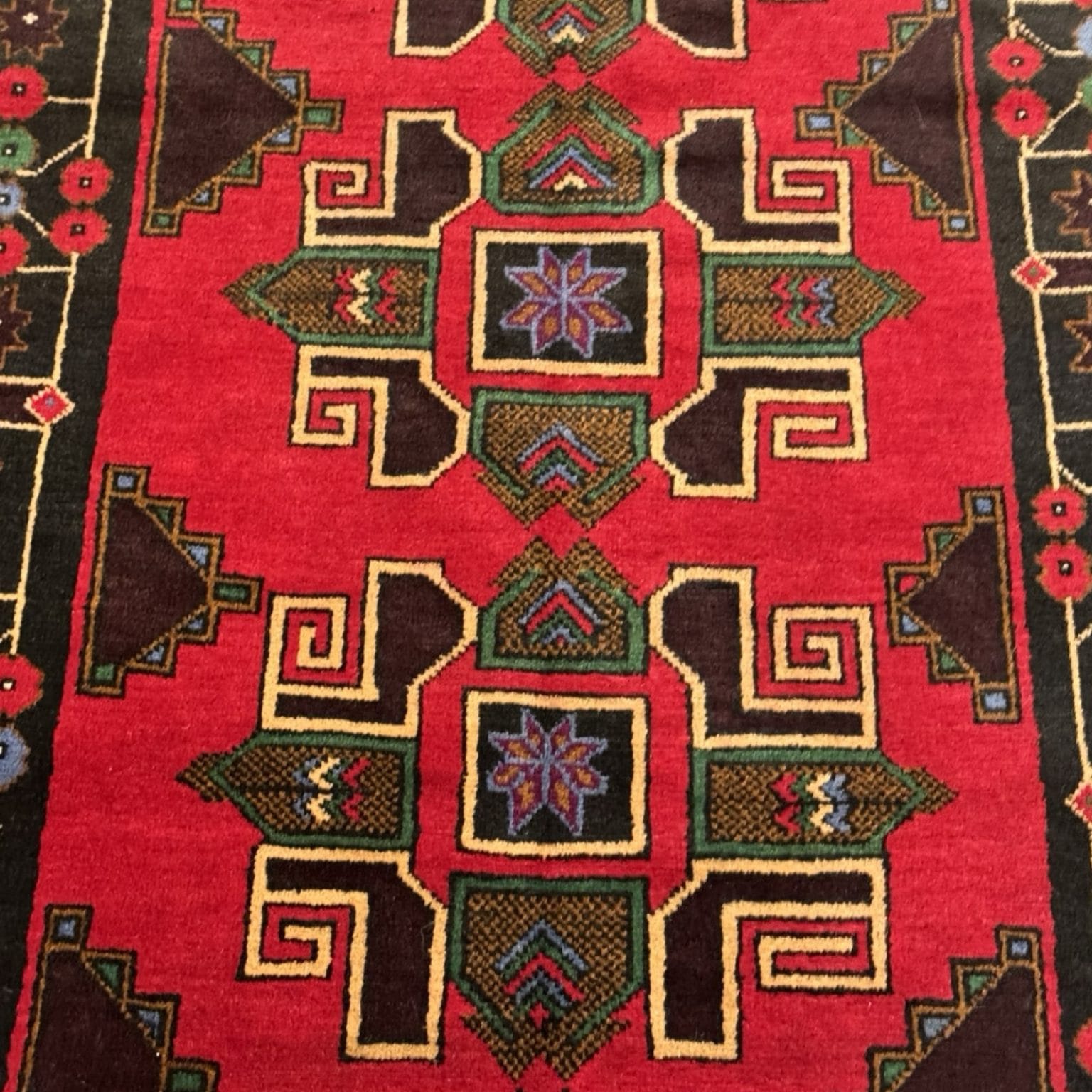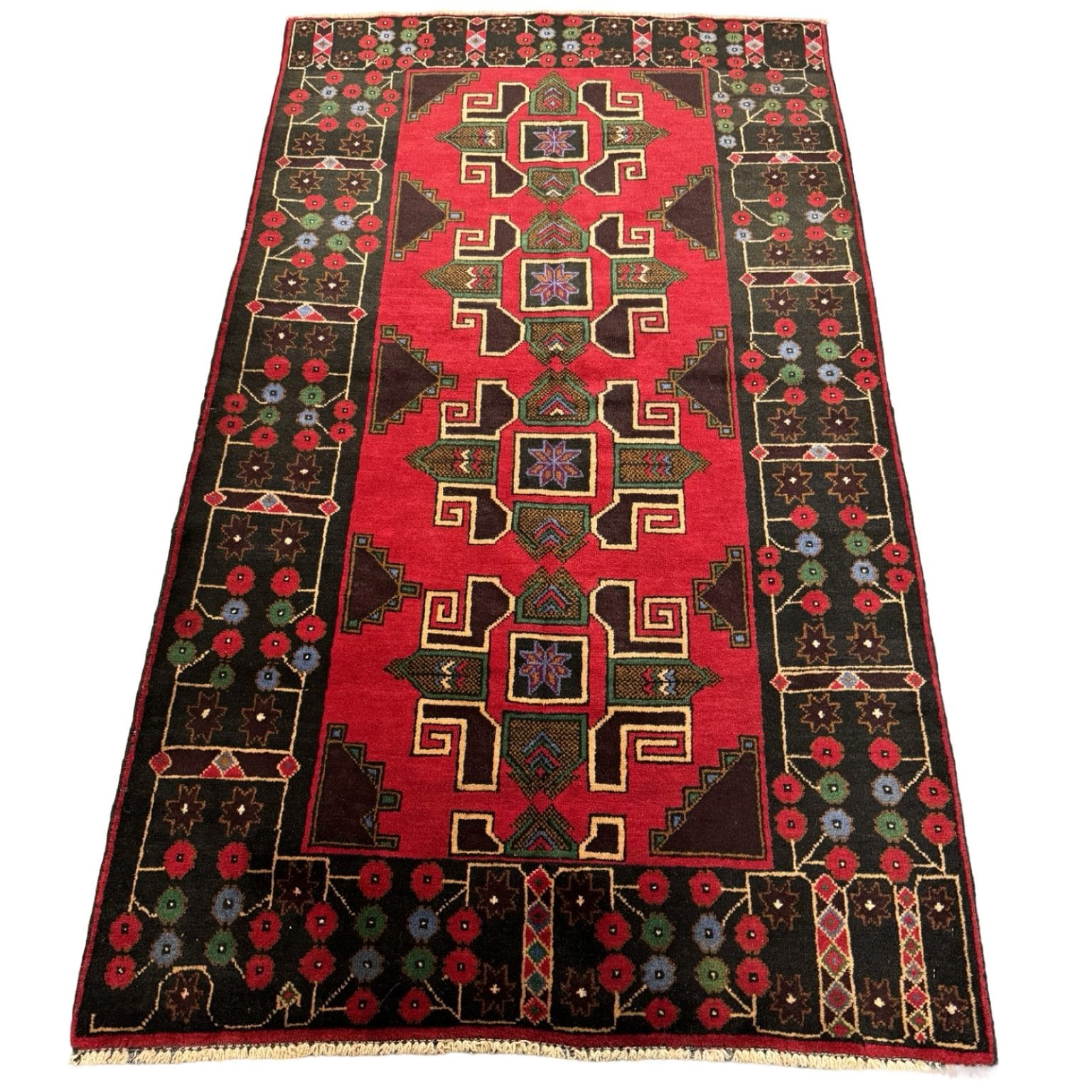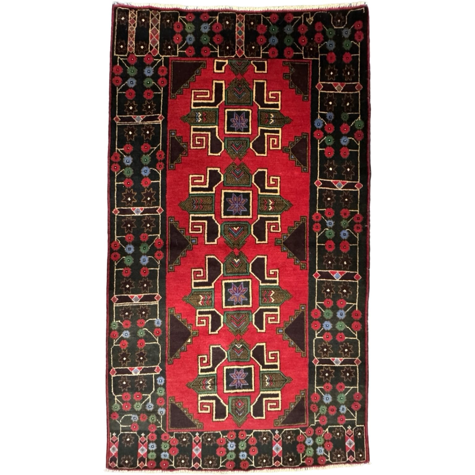 The Baluch rug from Afghanistan is a traditional handwoven rug known for its intricate geometric patterns and deep, earthy colors. It typically features motifs inspired by tribal heritage and is prized for its durability and craftsmanship.