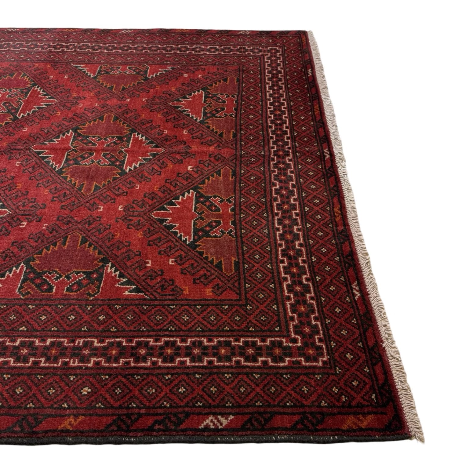 Enhance your living space with this exquisite Hand-Knotted Afghan Khal Mohammadi Rug, a masterpiece of traditional craftsmanship. This rug features a striking blend of deep red and blue hues, characteristic of authentic Khal Mohammadi rugs. The intricate geometric patterns and floral motifs reflect the rich cultural heritage of northern Afghanistan, making it a unique and timeless addition to any decor