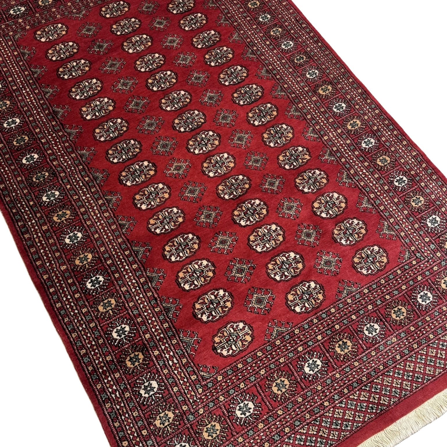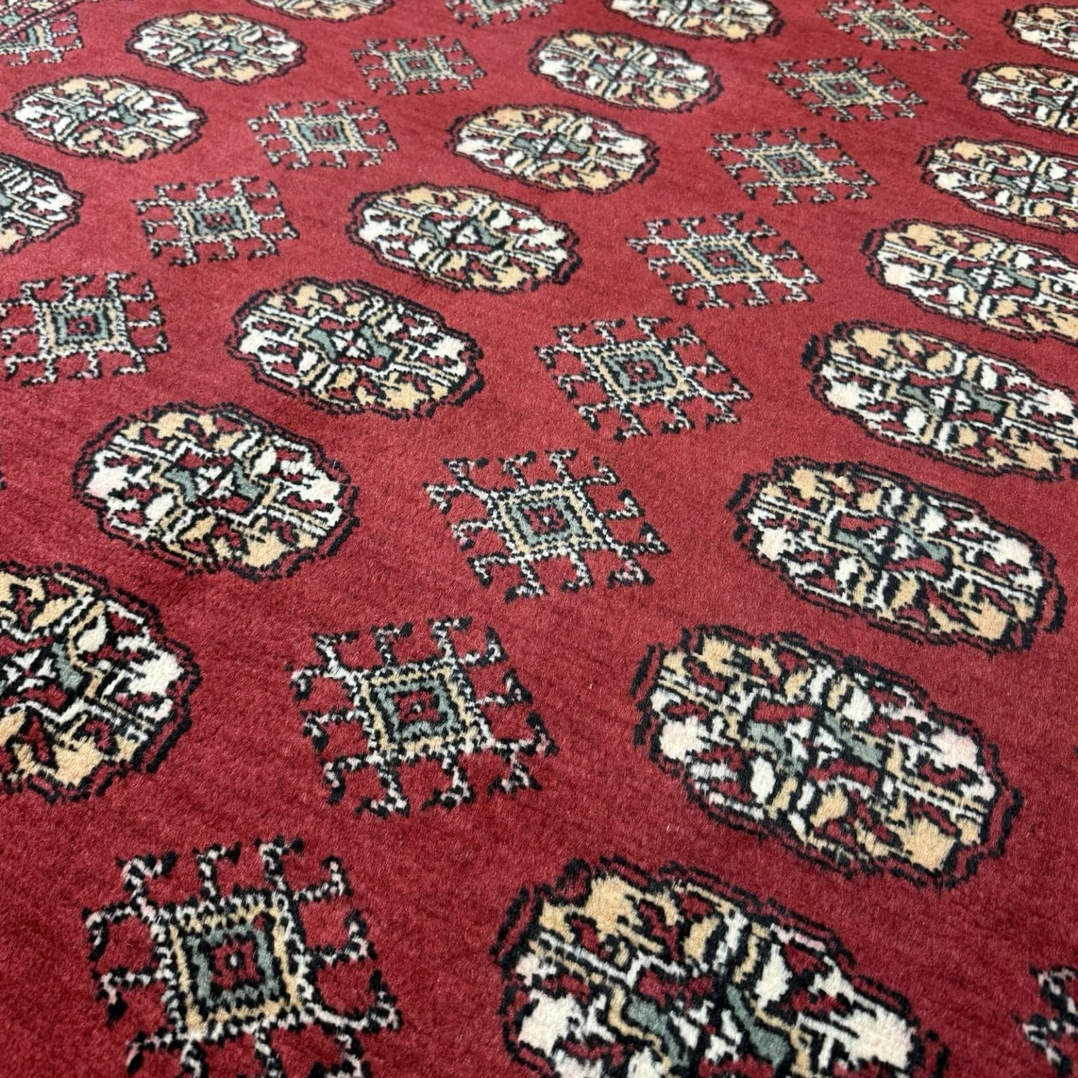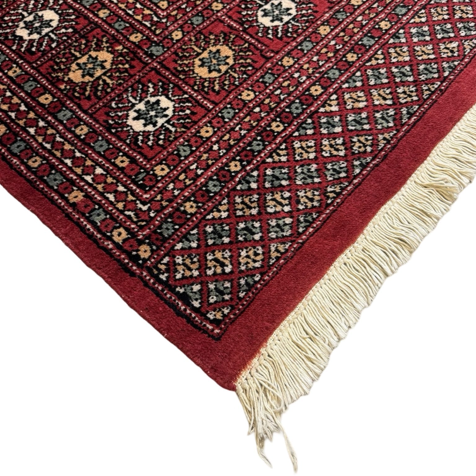 The Bokhara Karachi rug is a stunning hand-knotted piece that showcases traditional craftsmanship and timeless beauty. Characterized by its rich, deep colors—often featuring reds, blacks, and earthy tones—this rug typically displays intricate geometric patterns and floral motifs inspired by the historic Bokhara style.
