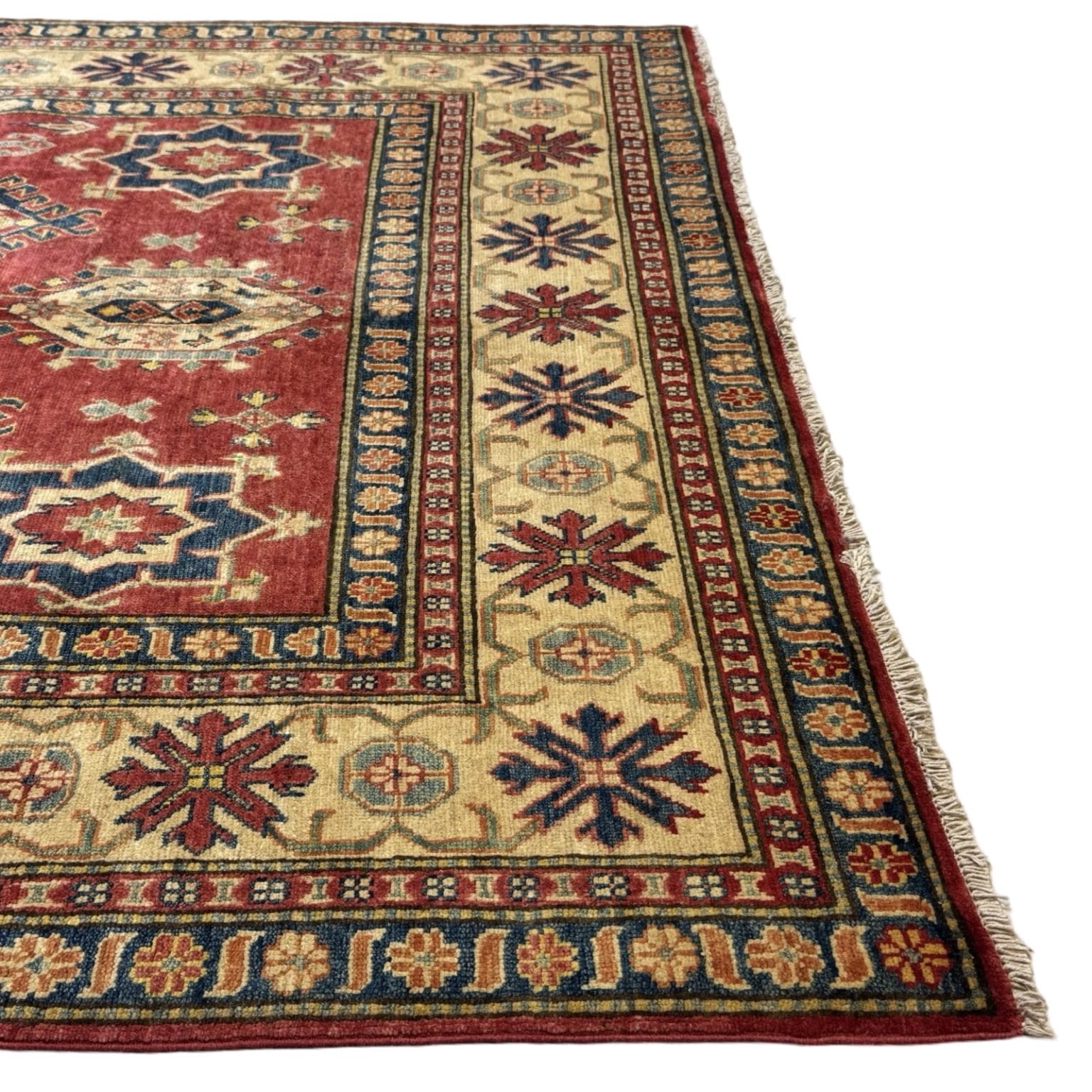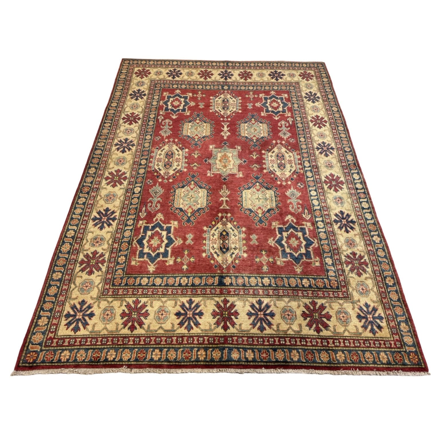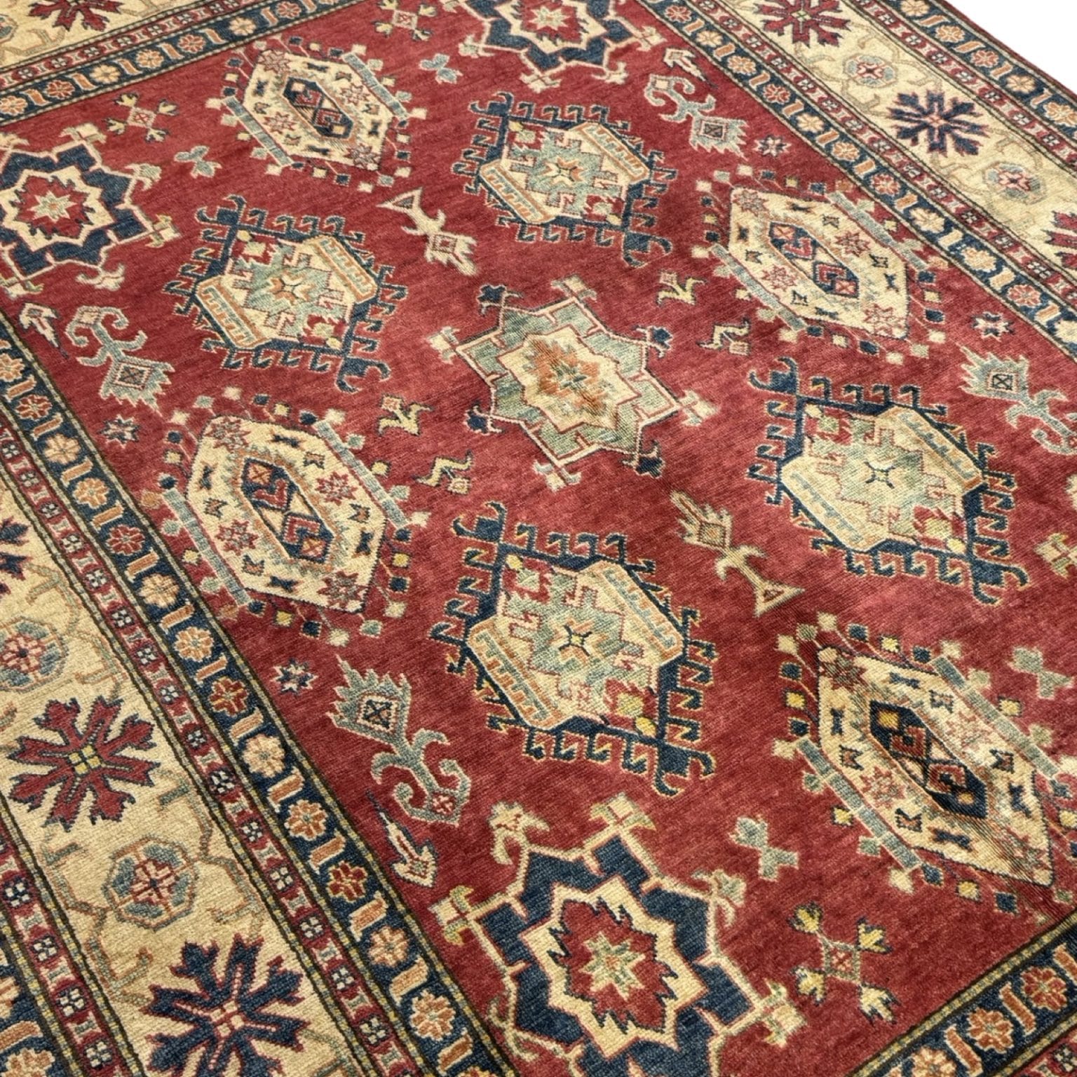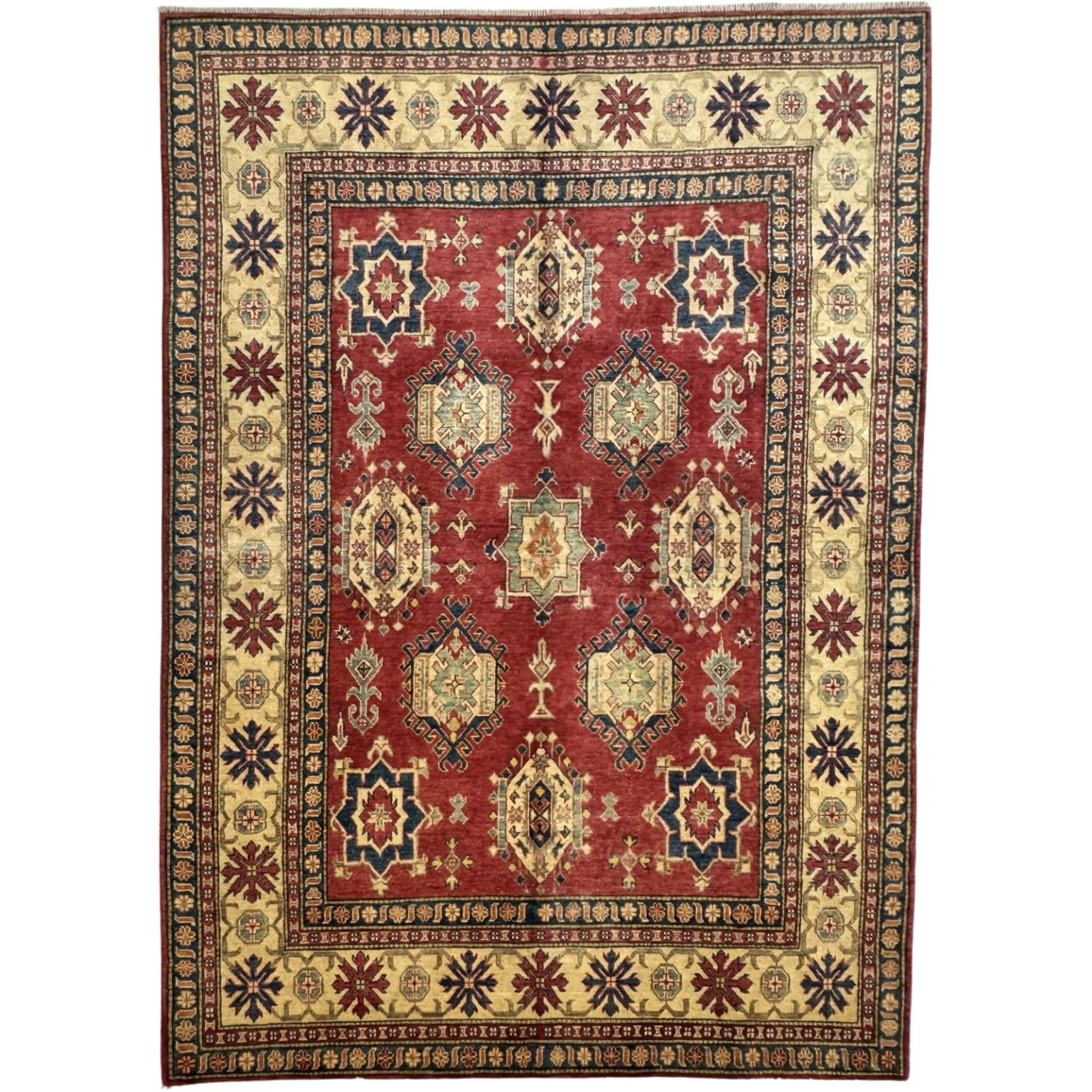 The Afghan Kazak rug is a hand-knotted treasure known for its bold geometric designs and vibrant colors. Made using traditional techniques and high-quality wool, this rug showcases the rich cultural heritage of the Caucasus region, offering durability and a striking aesthetic that enhances any space.