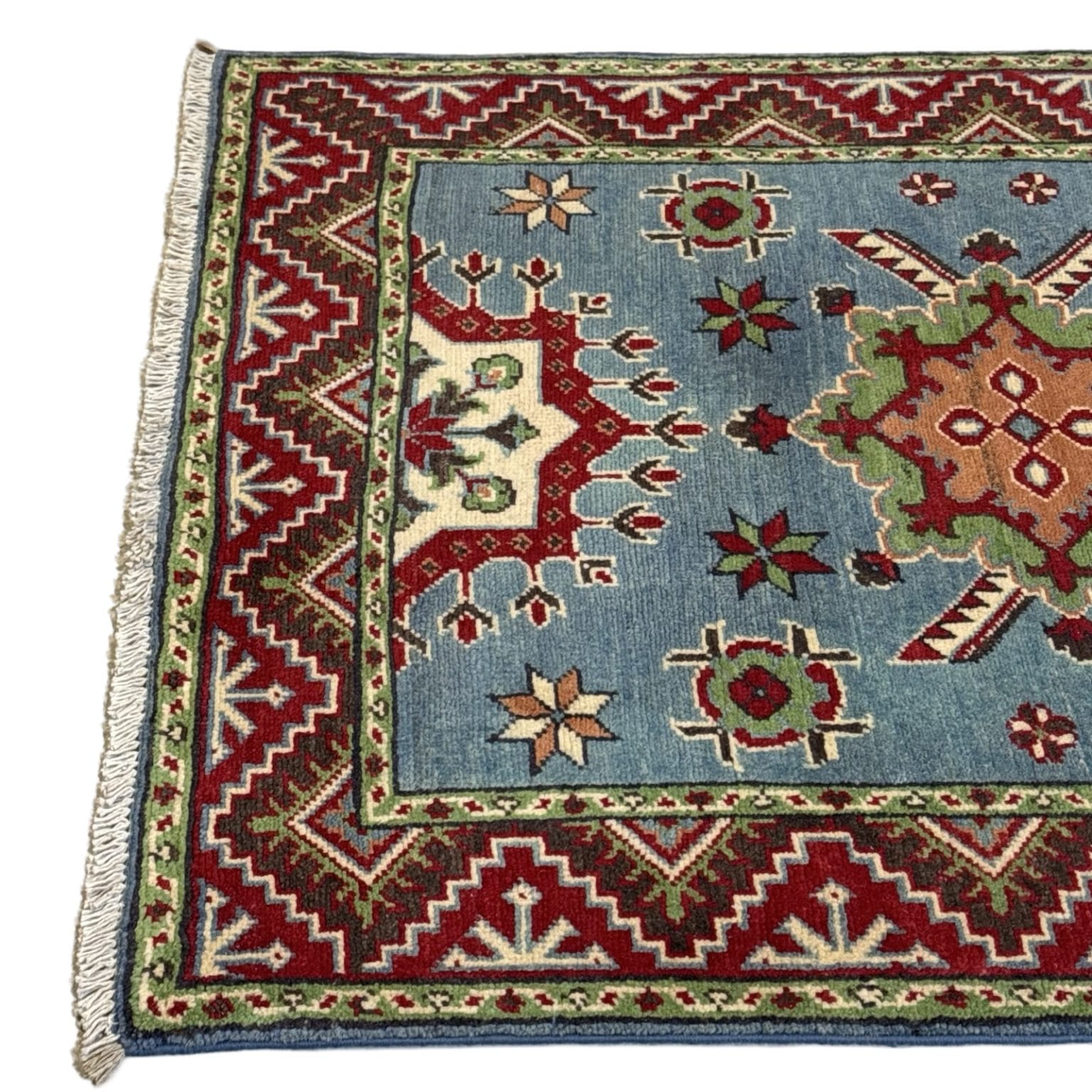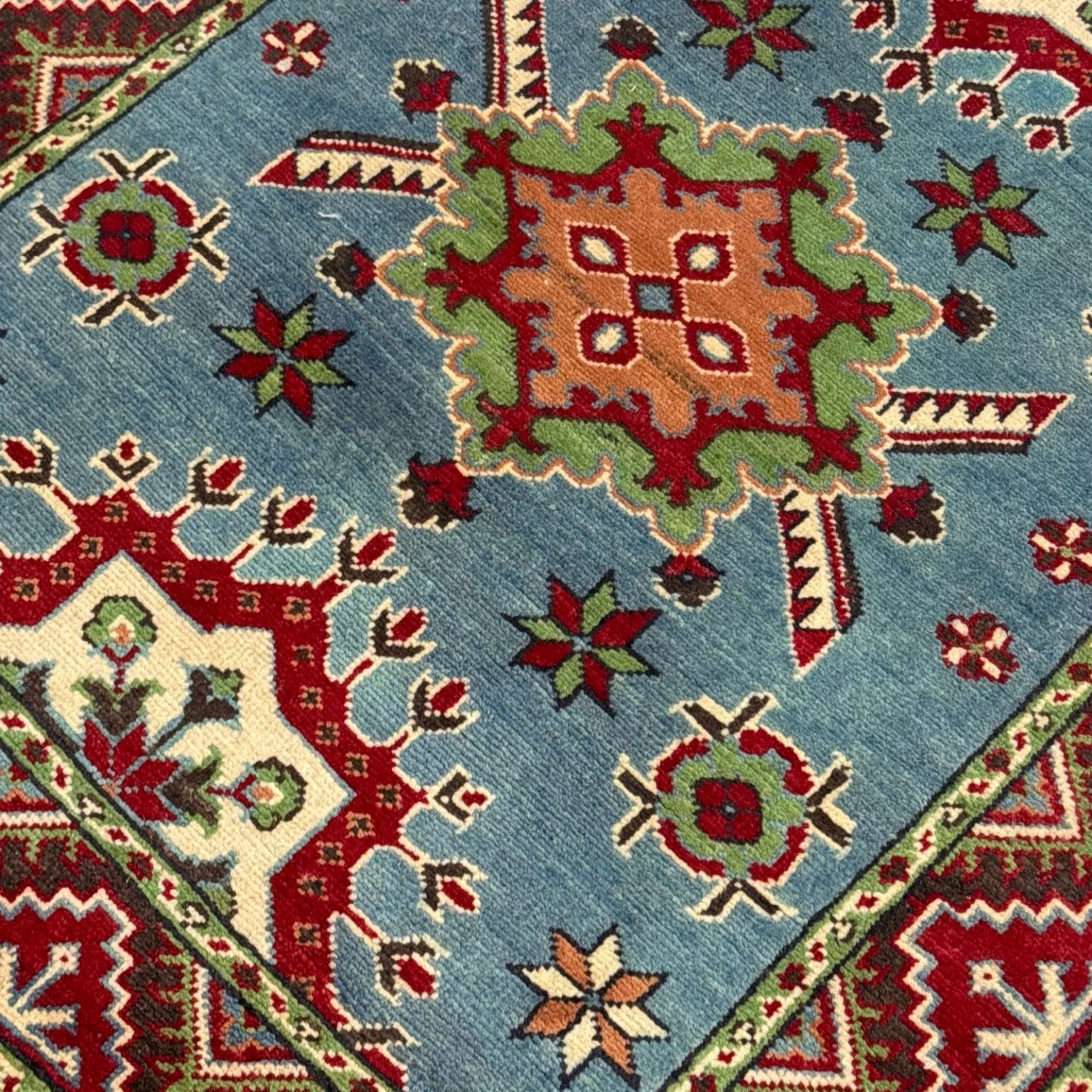 The Afghan Kazak rug is a hand-knotted treasure known for its bold geometric designs and vibrant colors. Made using traditional techniques and high-quality wool, this rug showcases the rich cultural heritage of the Caucasus region, offering durability and a striking aesthetic that enhances any space.