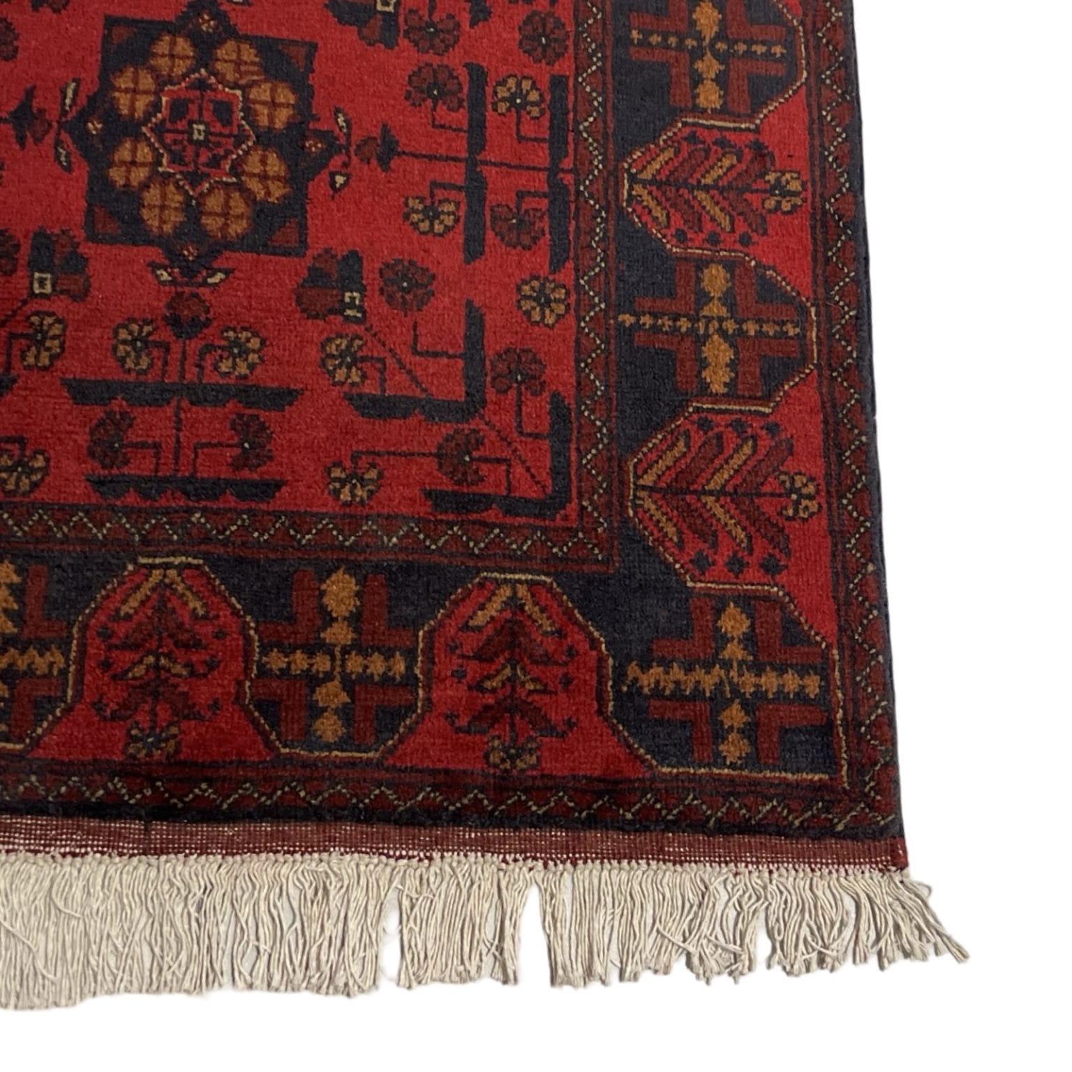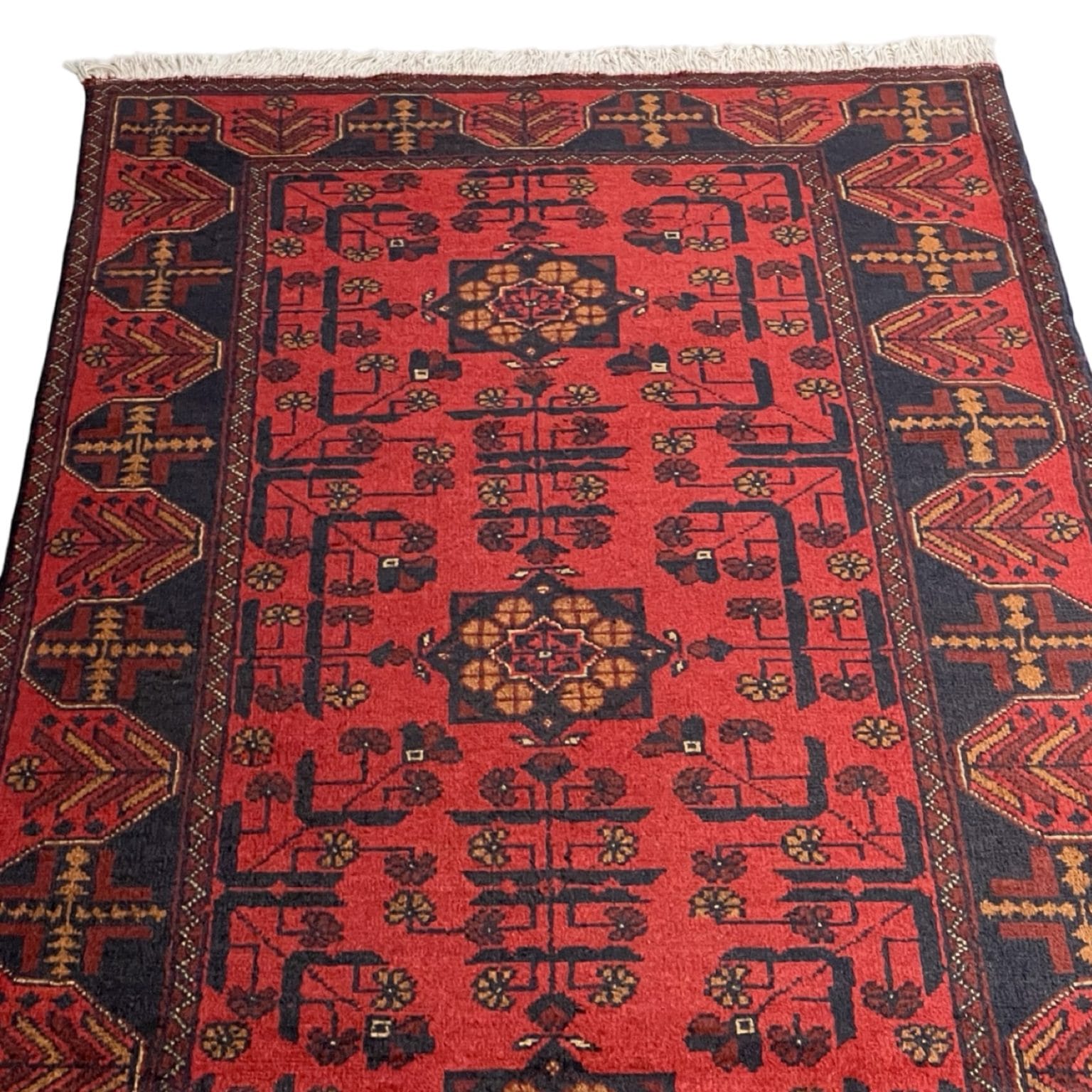 Enhance your living space with this exquisite Handwoven Afghan Khal Mohammadi Rug, a masterpiece of traditional craftsmanship. This rug features a striking blend of deep red and blue hues, characteristic of authentic Khal Mohammadi rugs. The intricate geometric patterns and floral motifs reflect the rich cultural heritage of northern Afghanistan, making it a unique and timeless addition to any decor