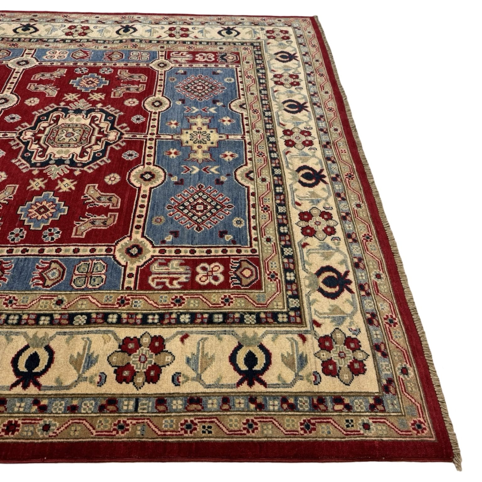 The Afghan Kazak rug is a hand-knotted treasure known for its bold geometric designs and vibrant colors. Made using traditional techniques and high-quality wool, this rug showcases the rich cultural heritage of the Caucasus region, offering durability and a striking aesthetic that enhances any space.