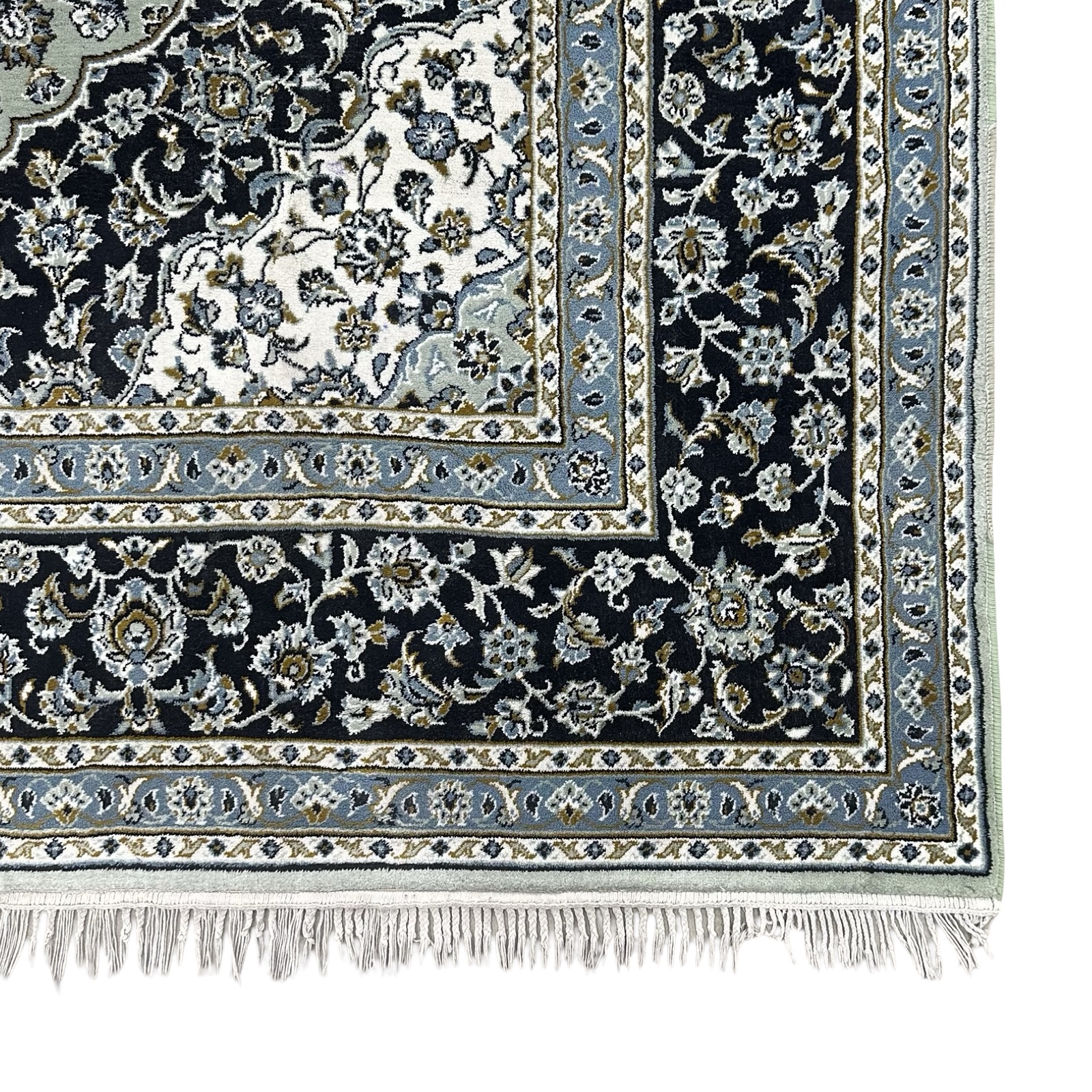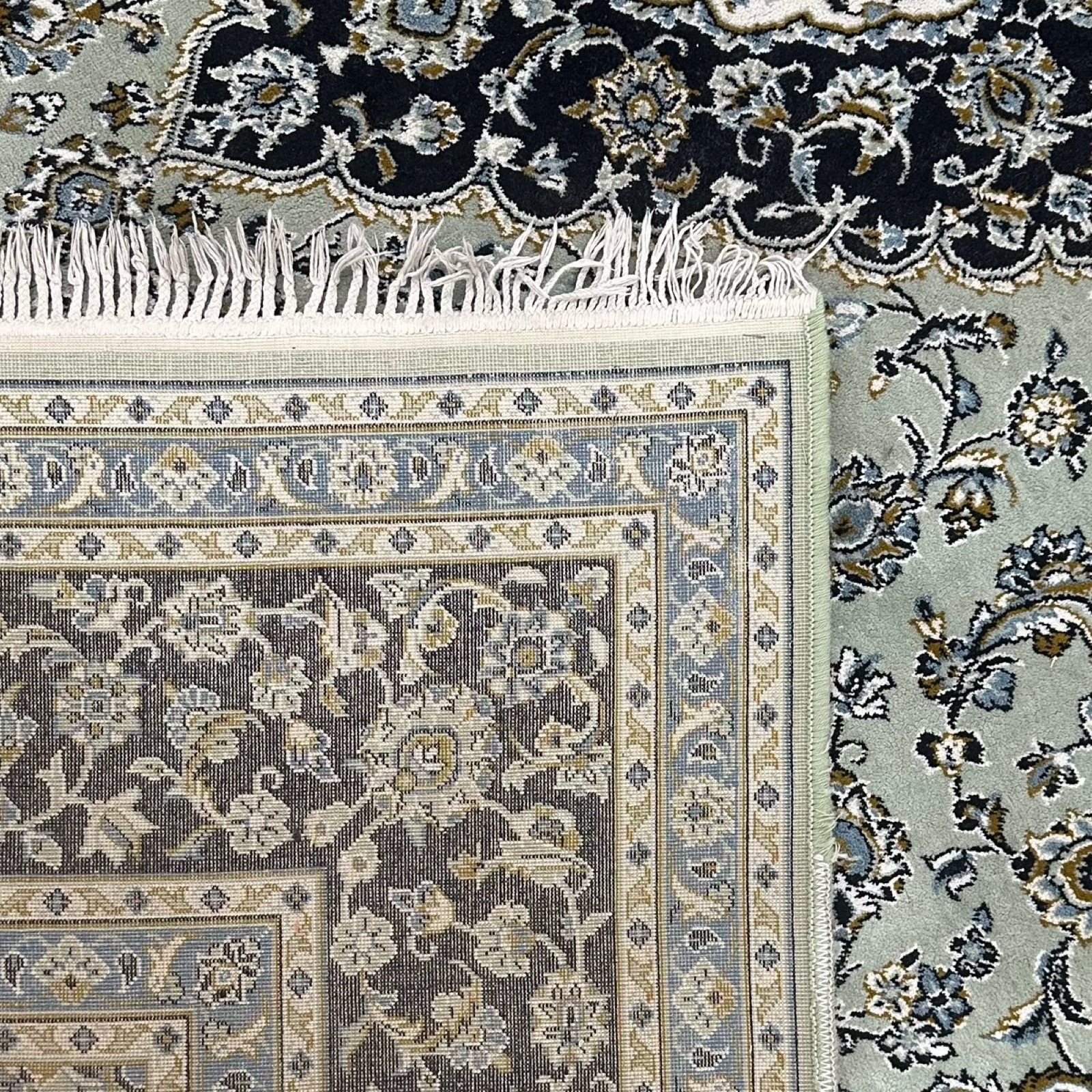 Finished with hand-detailed decorative fringes, it offers the charm of a classic Persian rug with the durability and easy care of modern production. Suitable for living rooms, dining areas, and bedrooms.