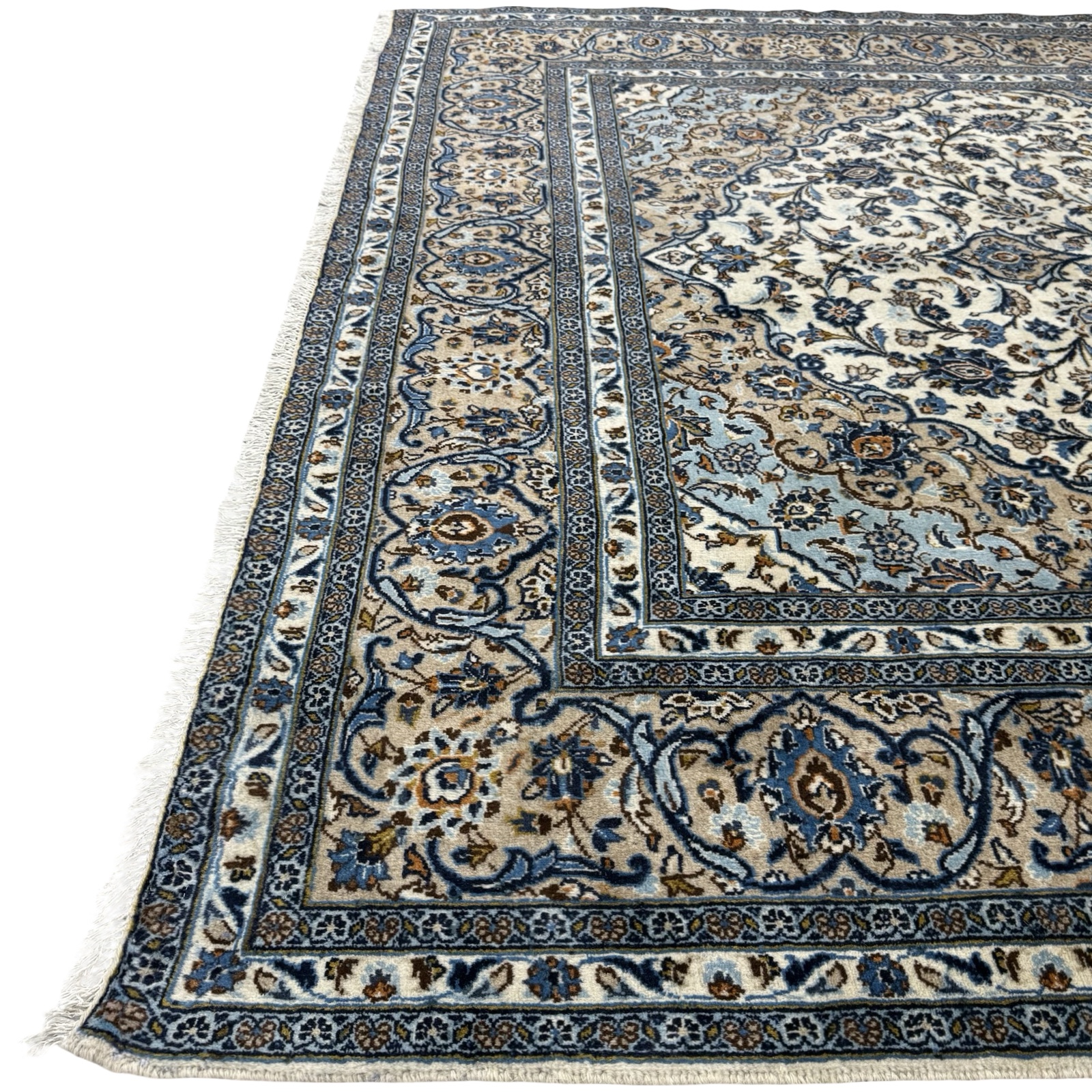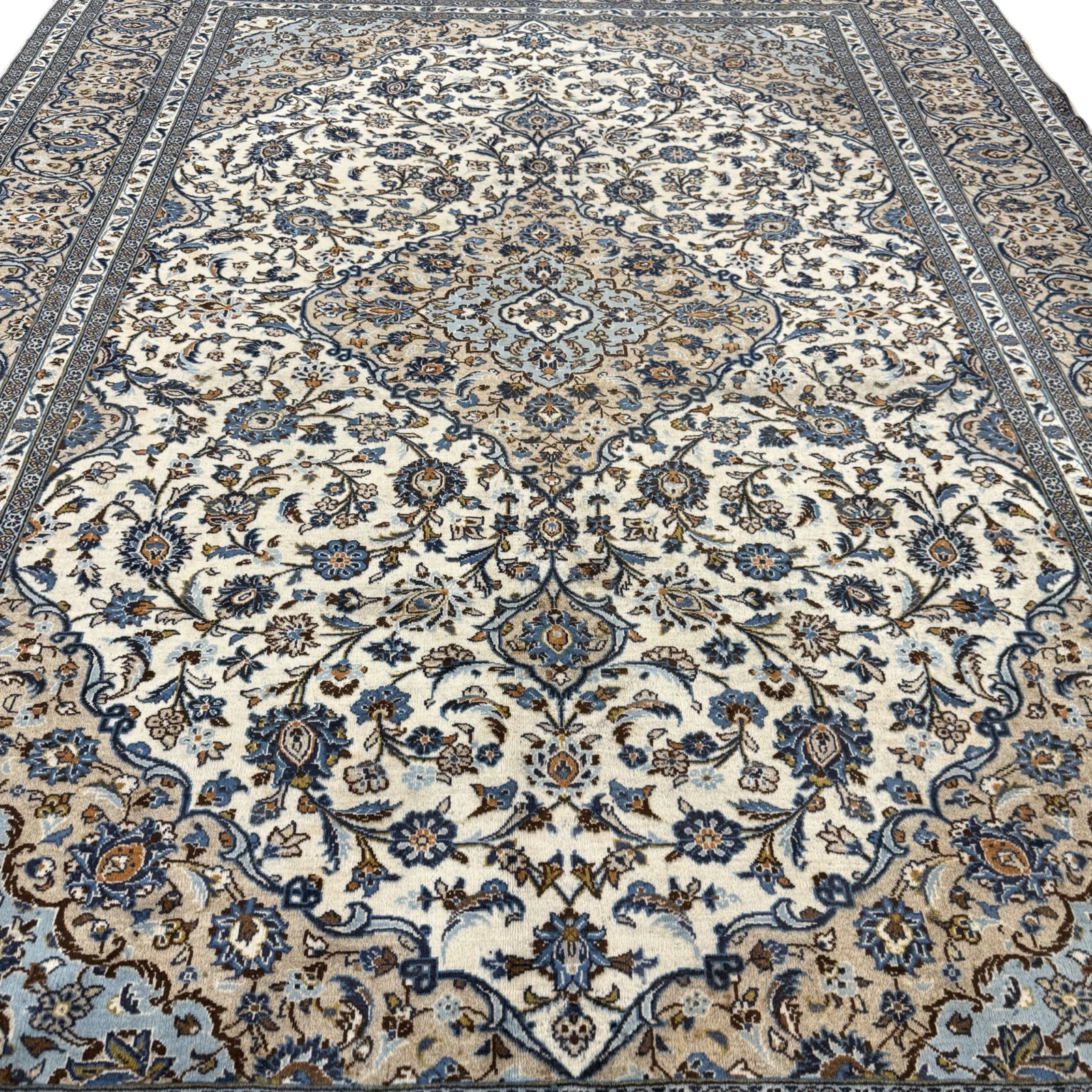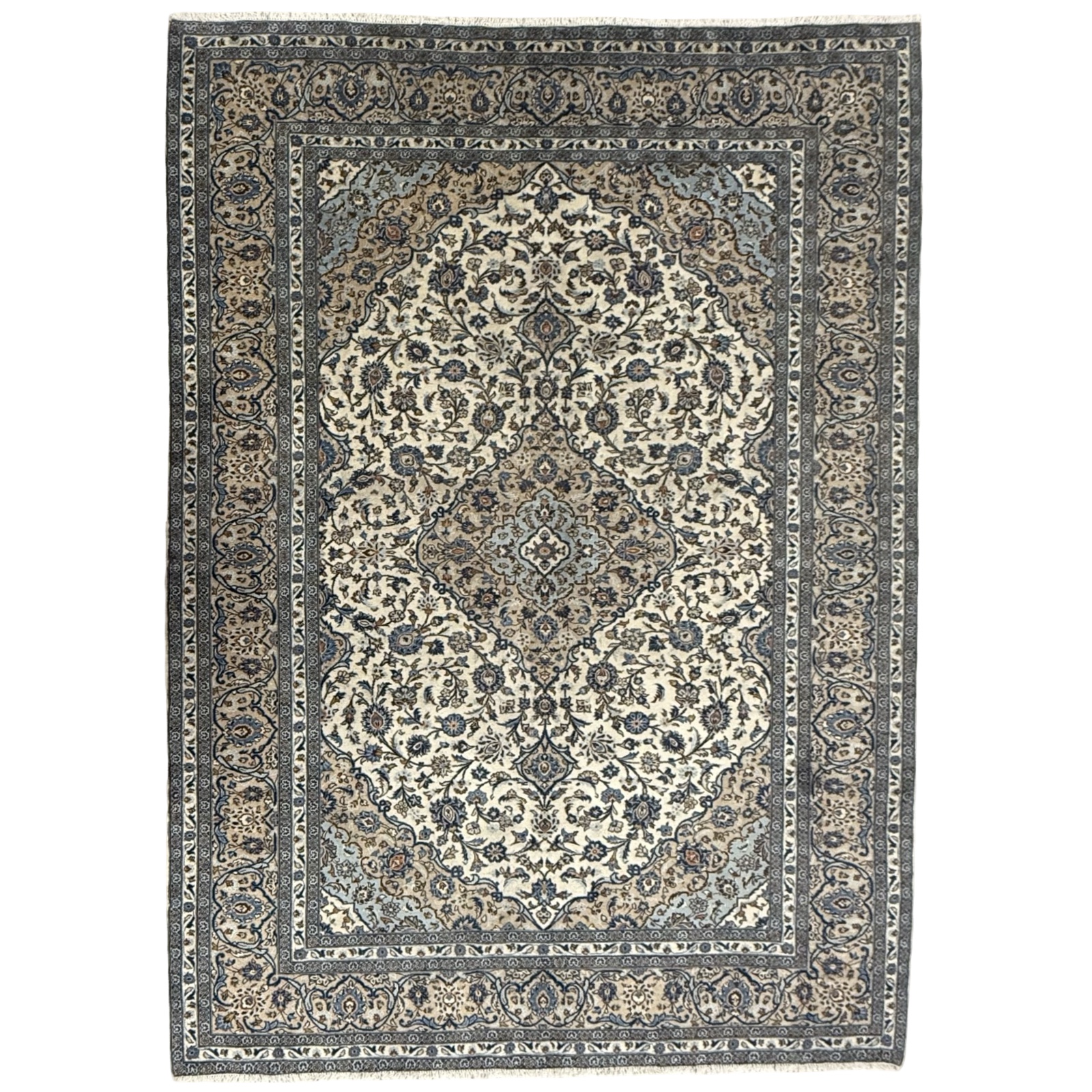 A Kashan rug is a high-quality Persian rug from the Kashan region in Iran, known for its intricate floral patterns and rich color palette, including deep reds, blues, and ivories. Made from fine wool, these rugs are durable, soft, and renowned for their beauty, making them a timeless addition to any home.