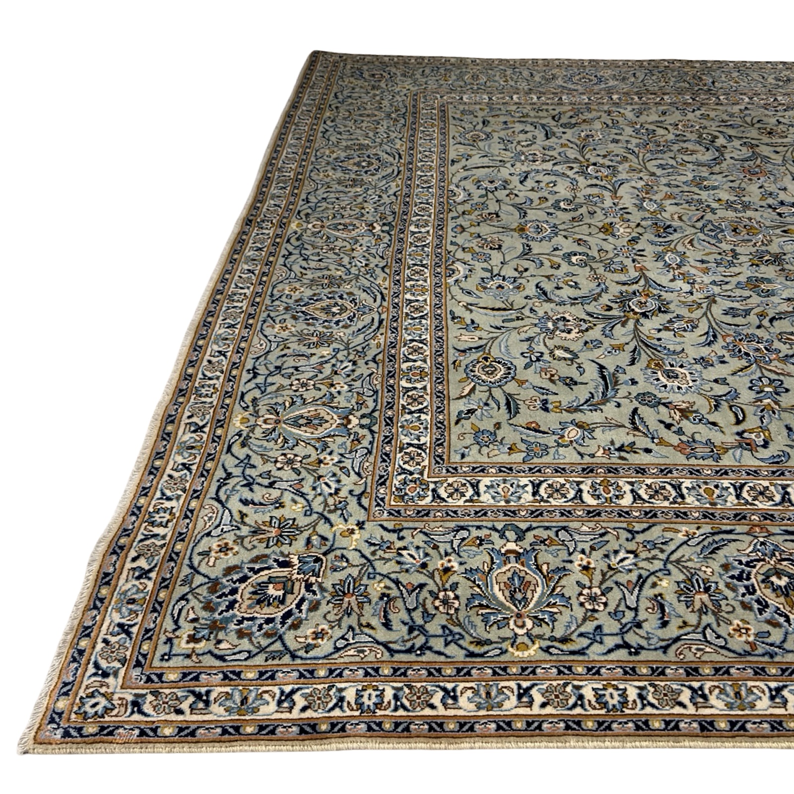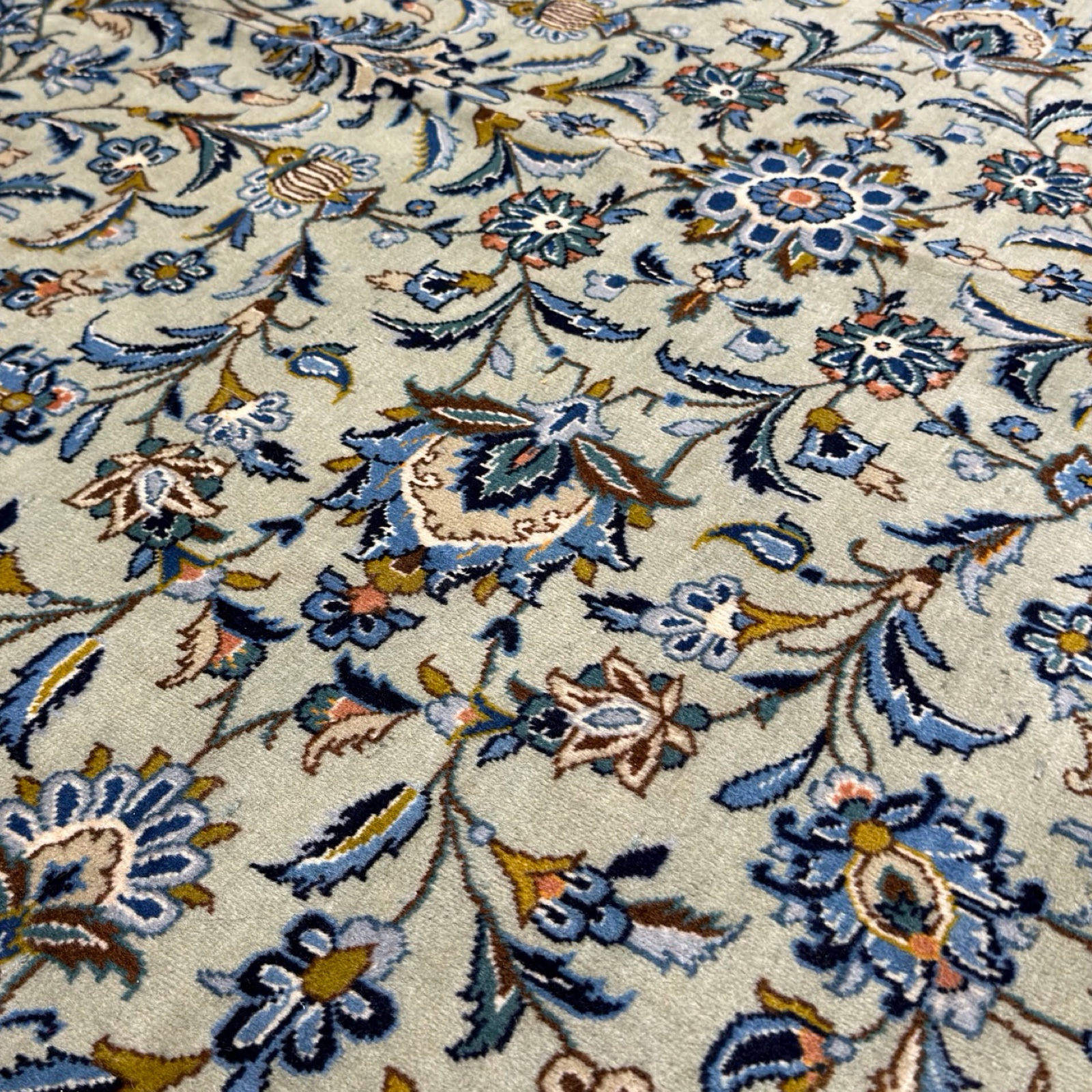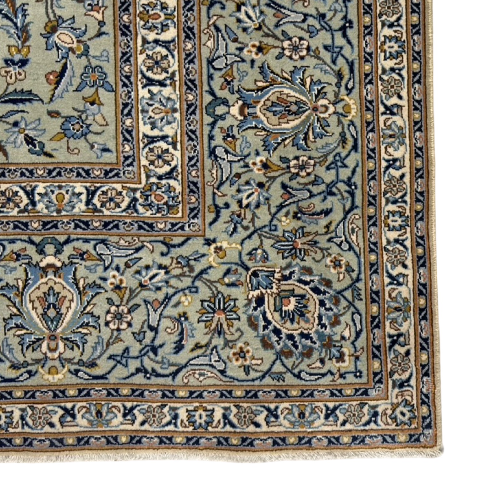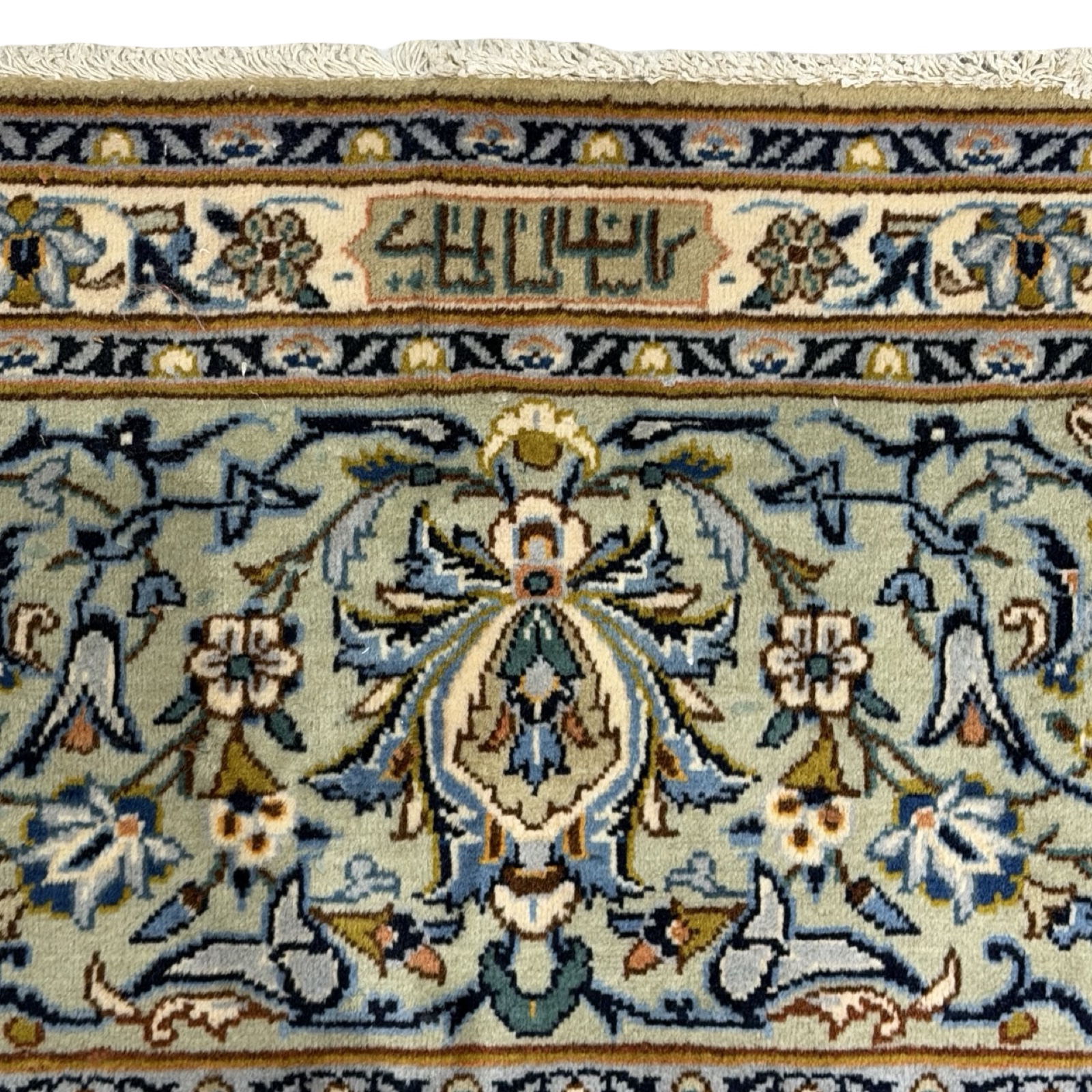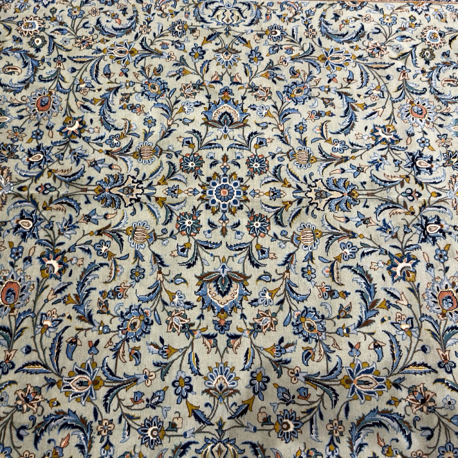 The colour palette is refined and timeless, with gentle shades of blue, ivory, beige, and subtle touches of gold and brown. Made with high-quality wool on a cotton foundation, the rug has a smooth, even pile and exceptional clarity in the pattern. Signed by the weaver, it reflects true Kashan craftsmanship and is a refined choice for collectors or interiors that value quiet luxury and detail.